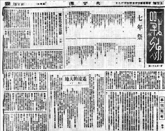 “九一八”作為重要的時間節點,改變了此前無差別的時間認知。具體的表現形式是在通行的民國紀年的基礎上,疊加了一種意義深遠的計時方式,即圍繞著“九一八”周年紀念出現的“九一八紀年”。如關心東北問題的傅斯年在1932年發表的《“九一八”一年了!》,茅盾的《九一八周年》,胡適《九一八的第三周年紀念告全國的青年》等。以“九一八”爆發為原點時間的計時方式在東北作家群出場后,得到更廣泛的運用和發揚,成為“勿忘東北”“抗戰到底”的標志。羅烽的《五年了?。?!——紀念我們慘痛的九月,并致故鄉的善忍的朋友們》、舒群《在夜深——紀念“九一八”五周年》、羅蓀《寫紀念文章——九一八的七周年》,都反映了東北作家此種新的時間處理形式。當時各報刊紛紛出版“九一八”特輯,如1938年9月18日《大公報》的“九一八”七周年紀念刊就以東北作家為中心展開,其中《東北人的聲音》是該報記者在“九一八”七周年之際對于毅夫、關夢覺、閻寶航等流亡關內的東北文化界人士的訪談記錄,《東北作家近影》報告了“二蕭”、孟十還、高蘭等東北作家的行跡,同期還刊載了舒群《七年祭》、黑丁《遙遠的大地》等東北作家為“九一八”撰寫的紀念文章?!熬乓话恕庇嫊r法顯影了中國人的時間感受和時代共識的根本轉變,同時,經過社會各界開展的“九一八”紀念活動的宣傳作用,加之東北作家作品的強化和散布,逐漸內化為全民族的心理事件和情感機制。