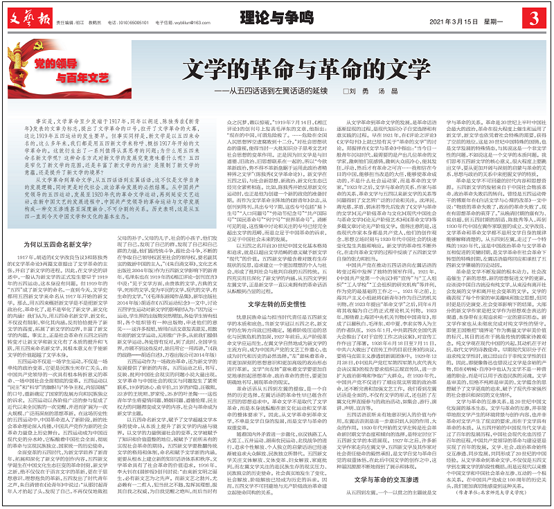 《文學的革命與革命的文學》一文見2021年3月15日文藝報“黨的領導與百年文藝”專題