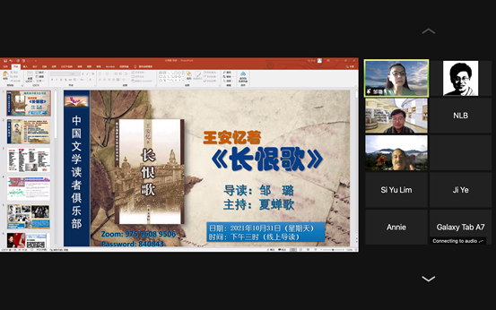 近日,新加坡“中國文學讀者俱樂部”舉辦了中國作家王安憶《長恨歌》的線上導讀會?;顒佑呻S筆南洋讀書會會長王華磊主持,新加坡作家協會會員、作家鄒璐導讀。60多名讀者線上參與了導讀會,新加坡國家圖書館的網絡平臺進行了直播。