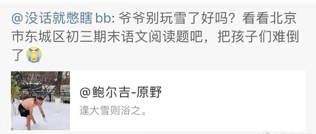 近日,多地中小學的期末考試剛剛結束,作家鮑爾吉·原野收到了一則微博喊話:“爺爺北京東城區期末閱讀題,海蘭花妹妹心里想的是什么???”原來,作家鮑爾吉·原野的少年小說《烏蘭牧騎的孩子》節選內容進入了2022年1月北京東城區初三語文期末考試閱讀題,其中有一題要求補寫出文中海蘭花的內心活動,該區的許多學生表示題目太難,紛紛去作家的微博留言求助,甚至有學生在作家多日前發的微博雪浴照下疾呼:“爺爺別玩雪了好么?看看北京東城區初三期末語文閱讀題吧,把孩子們難倒了?!?/p>