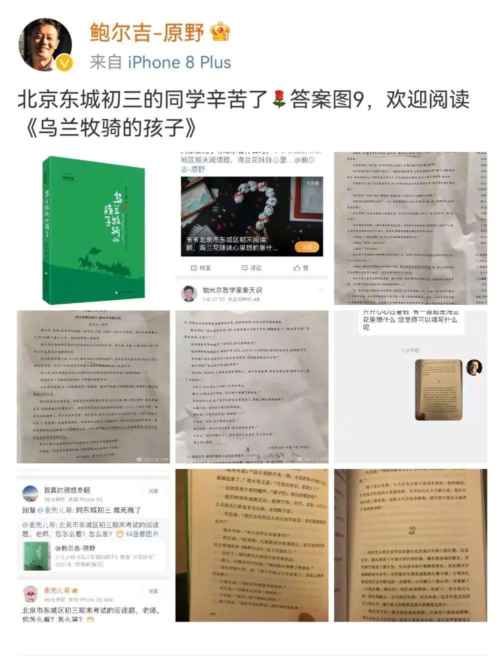 面對此種情境,作家本人熱情發微博回應,貼出閱讀題中所對應的《烏蘭牧騎的孩子》原著內容,為學生指點迷津。