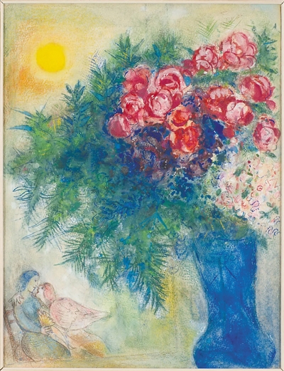完成于上世紀70年代的《紫羅蘭公雞》是此次展覽的最大亮點之一。這件作品以明亮的藍色為基調,畫家將自己化身為一位手持鮮花的小丑,身披白色婚紗的妻子貝拉騎著綠色的馬迎面走來,背景是馬戲團劇場和歡欣鼓舞的人群,倒置于畫面左上角的公雞是兒時故鄉的記憶,皎潔的月光、繽紛的花束營造出浪漫的夢幻氛圍,寄托了畫家對愛人、對家鄉的濃濃愛意。終其一生,夏加爾都在追求藝術的天真與純樸,用絢麗的色彩帶人們走進裝滿愛與鄉愁的夢幻世界。他曾說:“如果生命的調色板上只能有一種顏色,為生活與藝術提供全部的意義,這個顏色就是愛?!?/p>