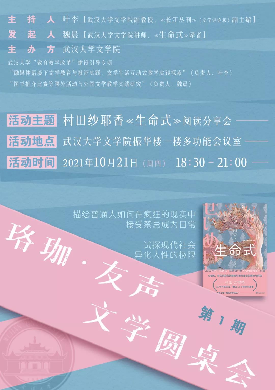 2021年10月22日,在武漢大學文學院,舉辦了“珞珈·友聲”文學圓桌會。來自包括武漢大學、華中科技大學、湖北警官學院的高校師生,圍繞村田紗耶香的最新短篇小說集《生命式》展開討論,分享了各自閱讀體驗。
