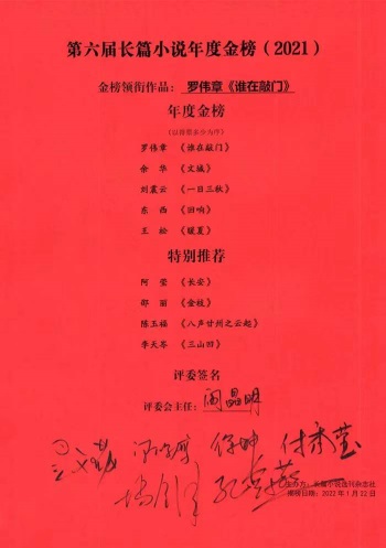 1月22日,“第六屆長篇小說年度金榜(2021)”評選活動在京召開終評會議。15部初評階段入圍的2021年度優秀長篇小說,經過前期的讀者網絡投票和專家評委團現場終評投票后,決出5部“金榜作品”。其中,羅偉章《誰在敲門》成為金榜領銜作品,余華《文城》、劉震云《一日三秋》、東西《回響》、王松《暖夏》入選年度金榜,阿瑩《長安》、邵麗《金枝》、陳玉?!栋寺暩手葜破稹?、李天岑《三山凹》則獲得年度推薦。根據作者陳彥的主動要求,入圍初評階段的《喜劇》退出本屆終選。