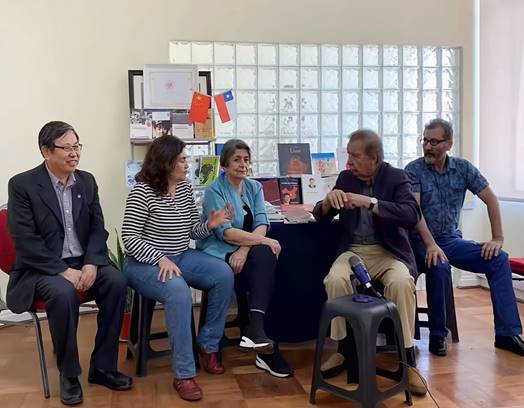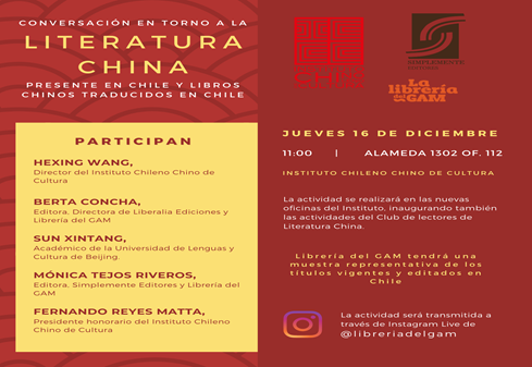 2021年12月16日,智利“中國文學讀者俱樂部”在位于智利圣地亞哥市中心的“智中文化協會”新辦公室正式掛牌揭幕,并舉行了首場活動“中國文學對話會”。智中文協主席、前智利駐華大使雷耶斯·馬塔教授、辛普雷門特出版社社長莫妮卡·特霍斯、雷特拉里亞出版社社長貝爾塔·貢恰、智中文化藝術中心主席胡安·卡洛斯·拉米雷斯和雷斯基金會主席卡洛斯·雷耶斯等現場出席了活動,北京語言大學拉美研究中心主任、阿根廷國會大學教授孫新堂線上參加?;顒赢斕爝M行了直播,有60多位讀者線上參加了活動。