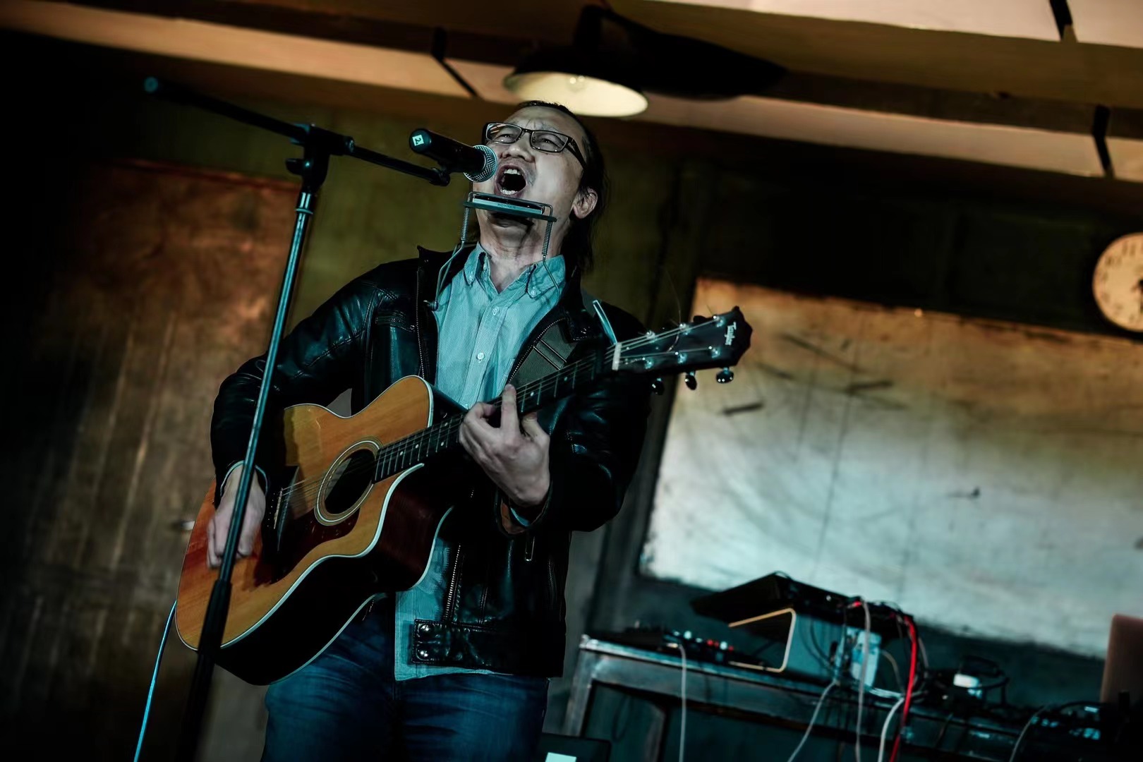 音樂人Gia Wang朗誦詩人宋逖作品時,詩集編者老賀在臺側沉思