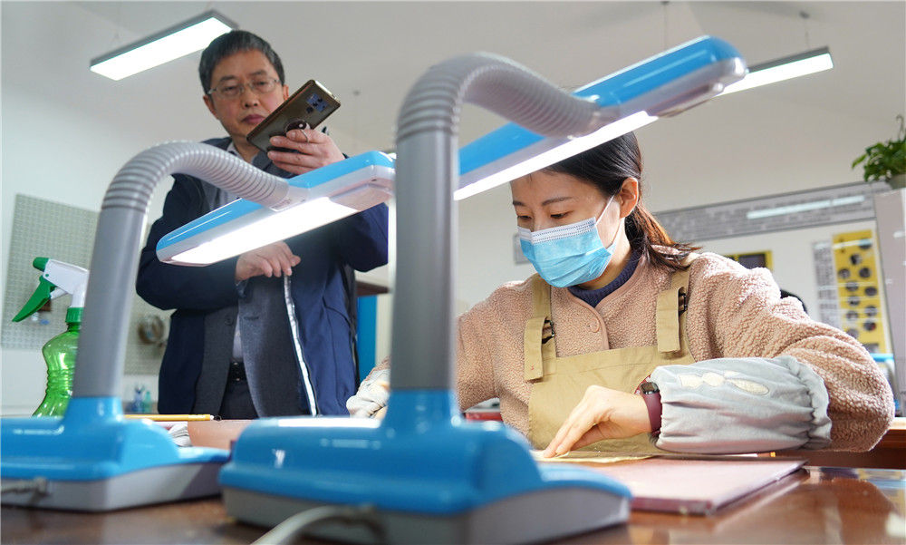 在四川省洛帶藝匠古籍文獻修復博物館,一名參觀者拍攝古籍文獻修復師的工作過程(2019年12月26日攝)。新華社記者 王曦 攝