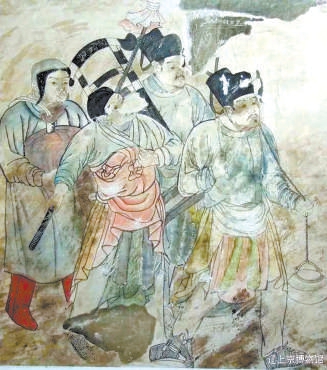 《歸來圖》,遼墓上的契丹壁畫。圖中四人,三人為漢族裝束,第四人髡發,雙手抱包裹。此圖顯示了遼宋交融期間契丹人的漢化。