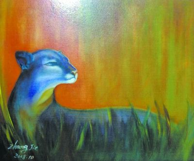 一幀畫于2008年的豹子,我愿意把它叫做雌性的雪豹。畫中雪豹正在回眸,被綢緞般亮麗而又鋒利的闊葉草簇擁。那柔韌、結實的頸部與修長、矯健身軀所構成的優美曲線,襯著層次豐富的橙黃色眩目背景,使整個畫面充滿彈性的緊張感。逆光中的雪豹,當它的脖頸被一團側光照耀時,作者有意凸顯的這個局部就煥發出揉雜著淡紫羅蘭色的高貴。接著你會被雪豹的眼神吸引:孤傲、警覺,又充溢著濕潤的憂郁,一種不打擾同類亦不打擾人類的自尊。我被這豹子的眼神所打動,強烈的主觀刻畫剎那間連接了動物和人心的溝通。對照那幅“寫意”的側臉女人,與這雪豹竟有一種靈魂與氣質上莫名的神似。在張潔的畫作里,與生俱來一種人與動物、動物與風景之間的平等和信任。在她心中的風景里,也說不定動物比人更像人。我不能說這幅作品在藝術上達到何樣高度,但我可以說,張潔已顯示出她作為一個藝術家所必備的銳利眼光、表現能力和叛逆之心。她的畫面常大膽運用橙黃、橙紅、桔黃等顏色,亦有大面積綠色入畫,更證實了她對色彩的自覺訓練與胸有成竹的把控。黃和綠是油畫顏料里最容易被“畫臟”的顏色,張潔呈現給觀眾的是熱烈的明澄和清透的豐富。