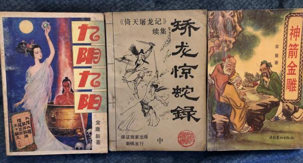 在我翻看挑選得起勁時,老板娘突然說了句:“有幾本錯版的書要不要?很難找的!”我問:“什么是錯版?”老板娘便解釋給我聽,以前的書商為了那些在香港、臺灣地區流行的武俠作家進大陸市場賣得好,把他們名字大部分改為了金庸、古龍、梁羽生,比如司馬翎是上世紀八十年代被改最多的臺灣作家,還有蕭逸、臥龍生、陳青云、柳殘陽、上官鼎也多是被改名引進的,這些錯版的書在后來的1990年代因為版權正規化后便絕版不再印制了,如今卻成了武俠愛好者搜尋收藏的對象。另外,還有取名“金庸新”、“金庸巨”甚至“金庸著”之類騙讀者掏錢的,就像現在許多商業大片被抄襲翻拍成的B級片,當然也有金童改編《射雕英雄傳》的前傳后傳《神箭金雕》與滄浪客的續寫金庸古龍系列之類的良心之作。