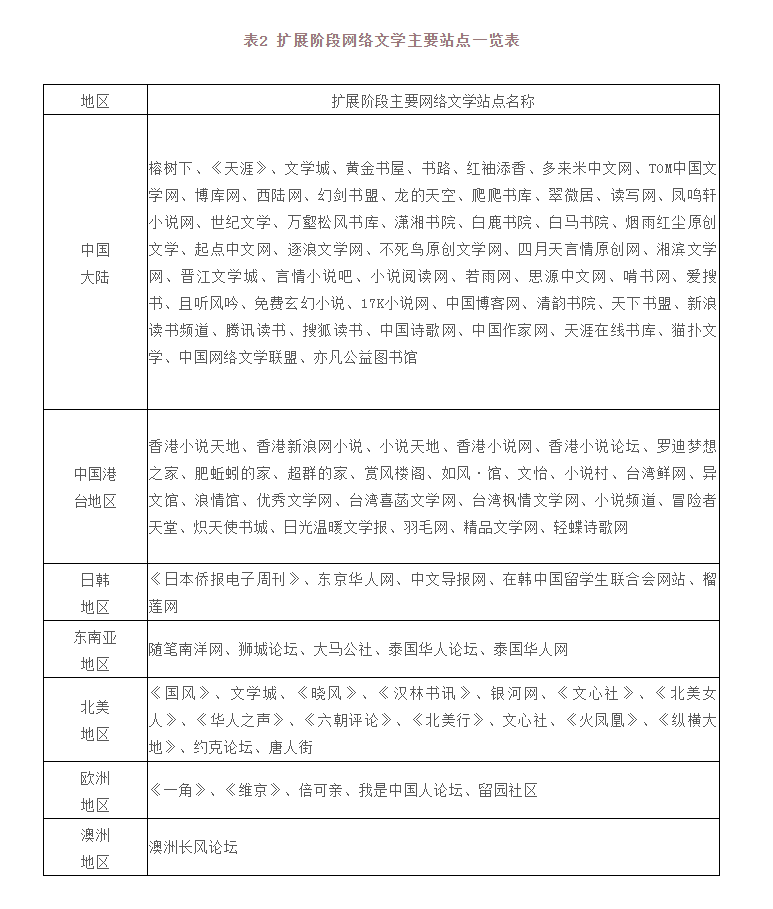 [31]自生階段網絡文學主要站點一覽表:表中站點統計以域名注冊所在地作為地區劃分標準。