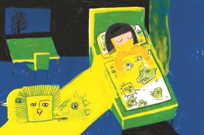 比如,前環襯之中用簡單而又童真的線條勾畫的小鳥、小豬、恐龍和獅子,讓暫時還未進入故事的讀者,有了打開濃郁藍色封面后的輕松愉悅之感。讀完故事,翻到后環襯,更能體會這種輕盈卻承載萬千之重的表達。因為正是通過正文故事中這四種動物不同的反應,讓女孩對男孩的情感層層遞進。這一點作者也做了詳細的闡釋:首先是在男孩窗前枝頭唱歌的小鳥,象征著女孩的感情被喚醒——如鳥兒喚醒清晨一般。之后是小豬,憨態可掬的樣子展現出一種單純和可愛——此刻女孩也多了一絲與男孩靠近的勇氣。接著是小恐龍面具——女孩在夜晚回家的路上保護著男孩,感情更進了一步。直到小獅子面具的出現,女孩的愛到達了最高點。她不在乎其他人的眼光,因為她的眼里只有男孩。獅子面具有著像太陽光一樣的射線,象征著女孩對男孩的愛像太陽一樣熾烈。