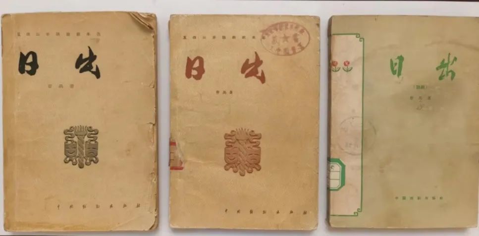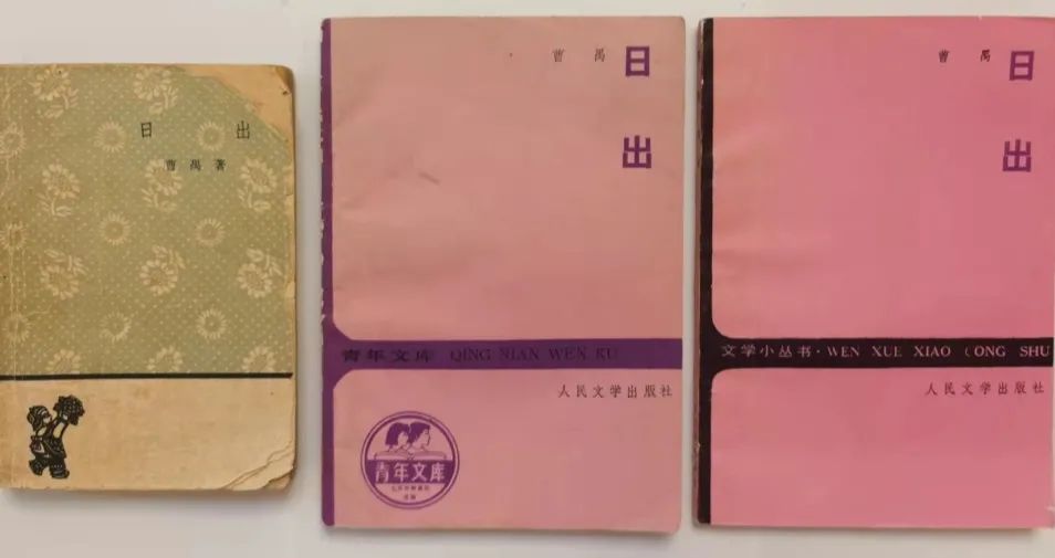 左:“小叢書”版《日出》1959年12月北京第1版第1次印刷;中:“青年文庫”叢書《日出》1959年12月北京第1版,1990年8月北京第1次印刷;右:“文學小叢書”《日出》1959年12月北京第1版,1992年12月北京第2次印刷。