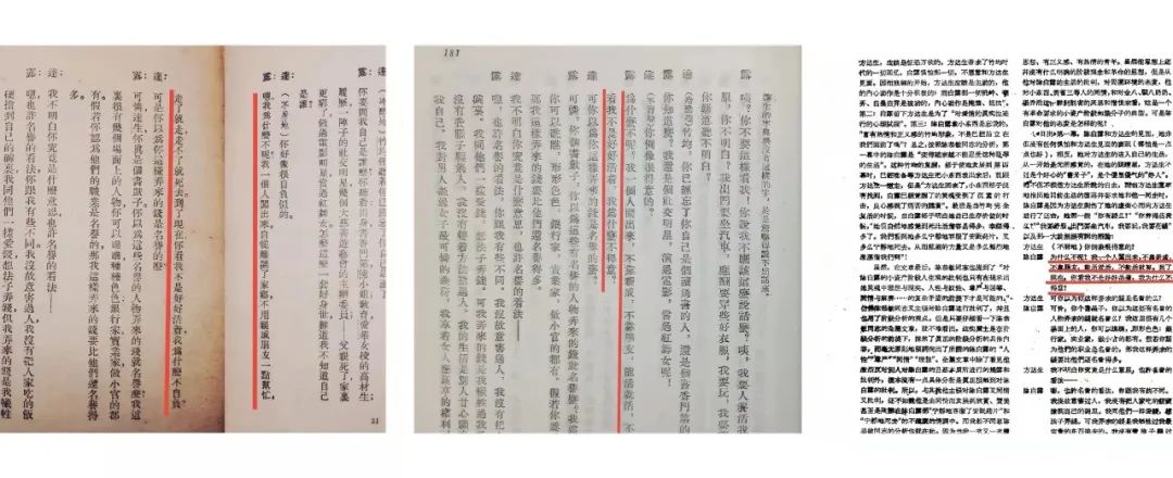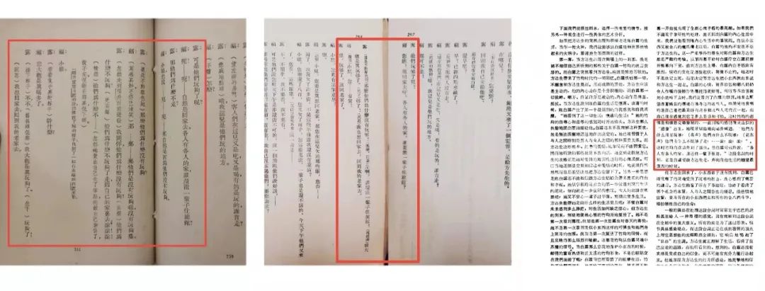 左:上海文化生活出版社《日出》,第250、251頁;中:人民文學出版社《曹禺劇本選》,第297、298頁;右:陳恭敏《什么是陳白露悲劇的實質》,《戲劇報》1957年第5期。比較可知,陳恭敏的引用出自上海文化生活出版社《日出》。