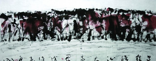 生命的風景,我是從多達數十幅不同主題的草原風光中看到的。如《套馬桿》(2010)、《草原的節日》(2012)、《那達慕開幕式》(2013)、《摔跤手出場》(2013)、《烏珠穆沁大馬群》(2018)等?!恫菰墓澣铡妨攘葦倒P,一組蒙古漢子歡快地搭肩踢腿舞蹈得以呈現,看著他們,就像聽到了踏著節拍的強烈節奏?!端邮殖鰣觥肪€條多了不少,摔跤手甩開的長袍、飄起的衣襟、雄健的跨步,傳遞出他旺盛的生命力。137*309厘米的大幅作品《烏珠穆沁大馬群》中,馬匹繪滿了畫面,既看不出馬群是向人前踏行,也看不出馬群是向天邊飛馳,但是,就是令人感到馬群的巨大生命力!或許畫家正是通過模糊的、聚集的、色彩不一的馬匹,傳遞了草原上健康的旺盛的熱烈的生命。