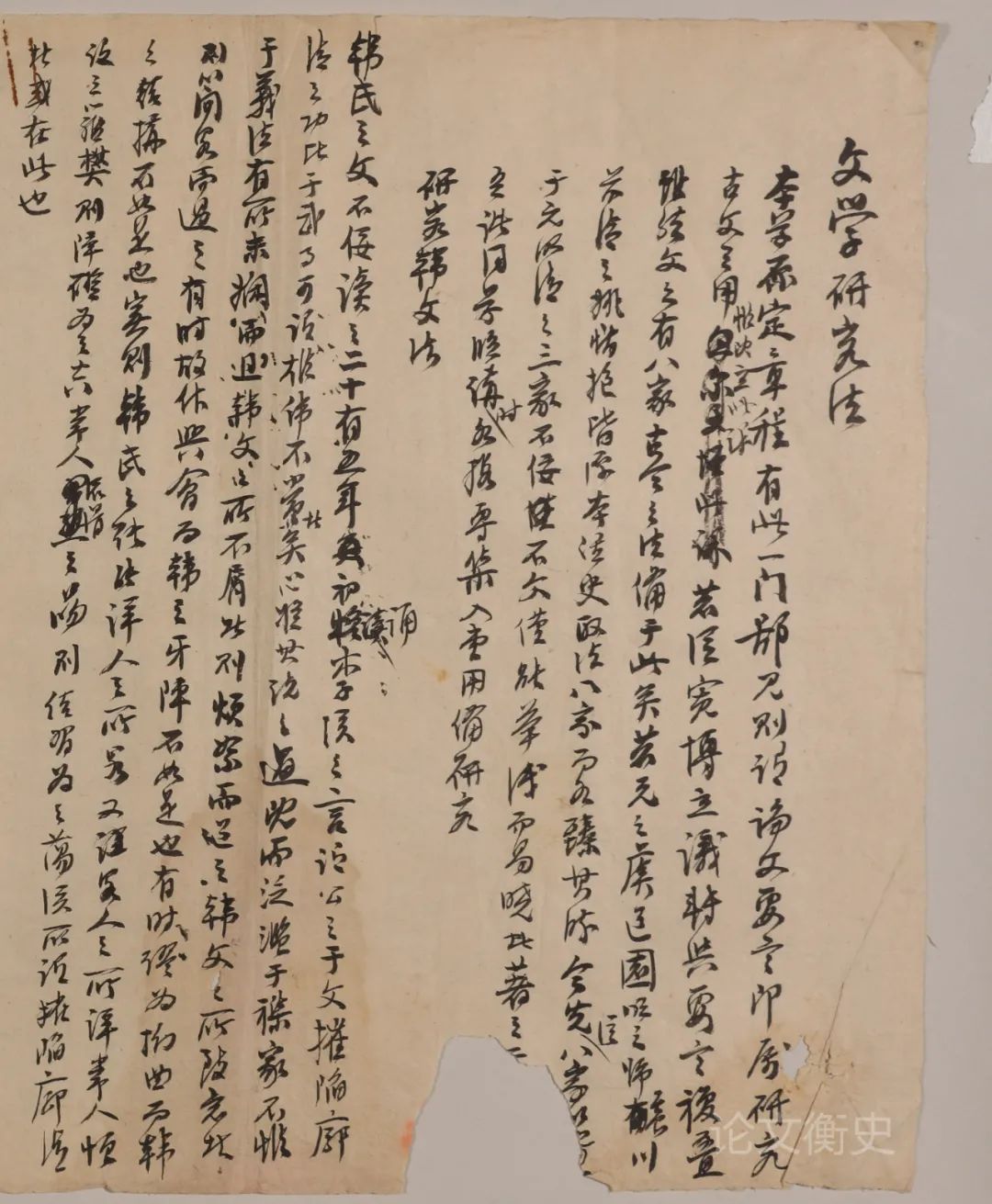 初見此稿,便覺眼熟。正文部分列出小標題“研究韓文法”,以下第一則“韓氏之文,不佞讀之二十有五年”,至所書最后一則“《諱辯》一首,已見之‘文章流別’”,經檢出自藏之《韓柳文研究法》對照,此九條果然一般無二。最為難得的是,手稿篇首尚多出一段低三格書寫的引言,先全錄如下(因原稿破損而有闕字),再做解說: