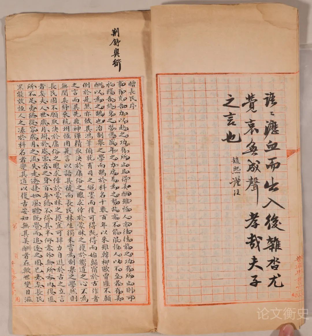 這冊文鈔書寫在“普通學書室用紙”上,不算封面封底,內文總共十四頁,收文十二篇,依次為:《黜驕》《先妣事略》《贈長民序》《贈趙仲宣員外序》《贈陳生序》《送嚴伯玉之巴黎序》《記水樂洞》《記云棲》《記九溪十八澗》《先母陳太宜人玉環銘》《鈞壙銘》與《祭宗室壽伯茀太史文》。凡此,都應當是林紓自己甄選出的代表作。不難查知,諸篇全部出自《畏廬文集》。最顯眼的是,此抄本每篇都有蜀中名士趙熙(字堯生)的評點。評點分眉批與總批兩種,其中眉批只見于七文,總批則多半有“趙熙謹注”、“趙熙”、“熙”或“熙注”一類的落款。