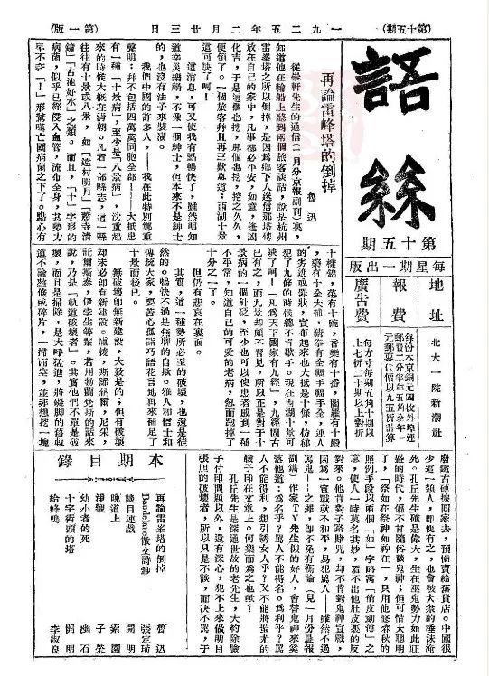魯迅《再論雷峰塔的倒掉》,載《語絲》周刊1925年第15期
