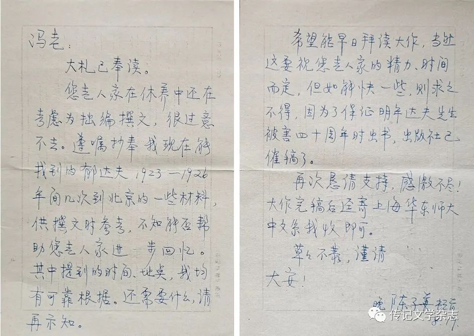 再者:四川大學劉傳輝同志上月來京云,陳煒謨寫過回憶郁達夫的文章,并已向您談及此事。不知他將陳文寄給您否?我也不知這篇文章寫得怎樣。