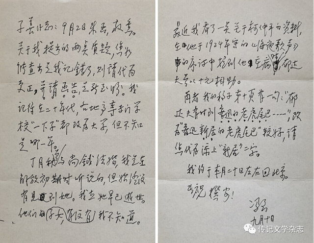 這是我現在能夠檢出的馮先生給我的第一封信,馮先生寫作《相濡與相忘》一文的認真與細致體現在此信的字里行間。初稿中的“郁達夫有時到魯迅的老虎尾巴……”一句,馮先生在信中囑我再加上“新居”兩字,改為“魯迅新居的老虎尾巴”,他認為添上“新居”后才“較好”,即為明顯的一例,兩字之增,不僅符合史實(魯迅1924年5月遷入阜成門內西三條21號),也說明了馮先生的嚴謹。而他在信中提到柯仲平,也并非一時興起,他當時又在構思憶柯仲平文,在完成了憶郁達夫文后,又寫下了感人的《仲平同志早年的歌唱》。