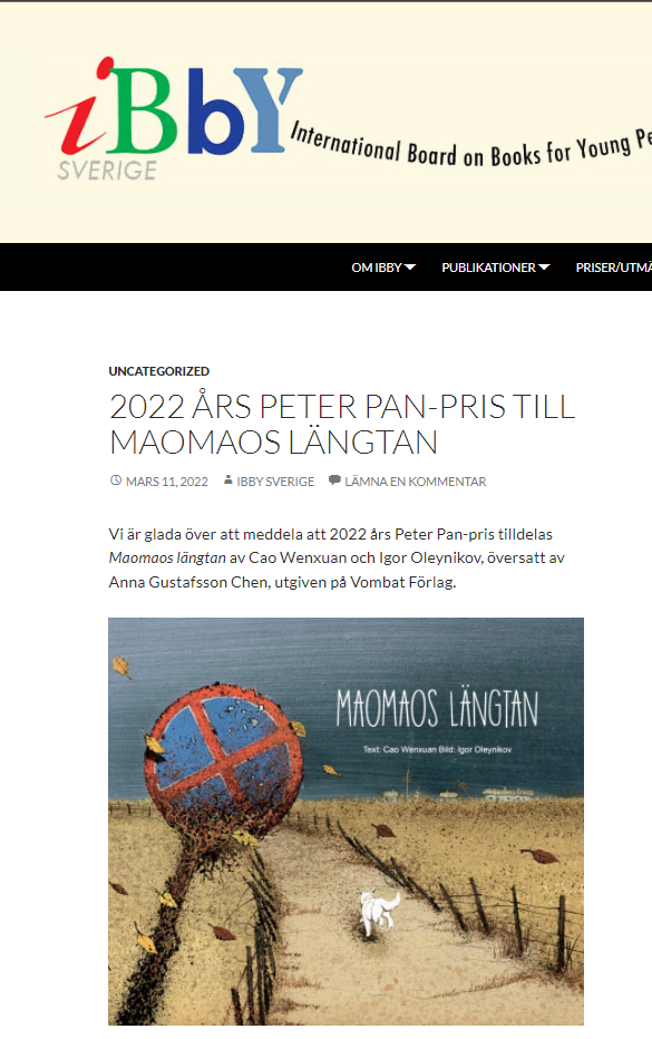 這也是瑞典小飛俠獎自2000年設立以來,首部被翻譯成瑞典語的中國大陸原創作品獲得小飛俠獎。