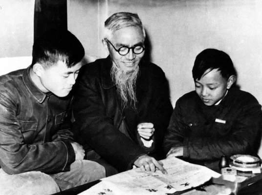 豐子愷和外孫宋菲君(右)、幼子豐新枚(左)在一起讀報。宋菲君當時讀初二。