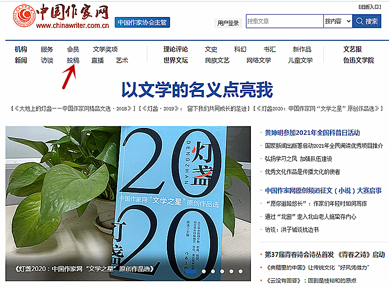1、首先登錄中國作家網http://www.rjjlock.com/ 在首頁頂端頻道分類位置找到“投稿”(標紅色箭頭處),點擊進入原創頻道。