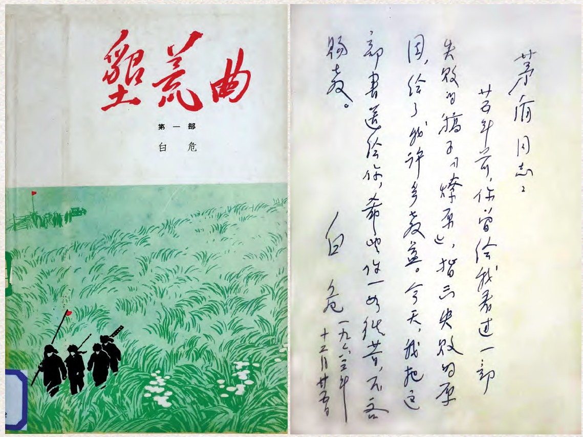 中國現代文學館茅盾文庫的茅盾藏書中存有當年作者白危贈送給茅盾先生的《墾荒曲》一書。書中扉頁題:“茅盾同志:若干年前,你曾給我看過一部失敗的稿子《燎原》,指出失敗的原因,給了我許多教益。今天,我把這部書送給你,希望你一如往昔,不吝賜教。白危,一九六三年十二月廿五日”。