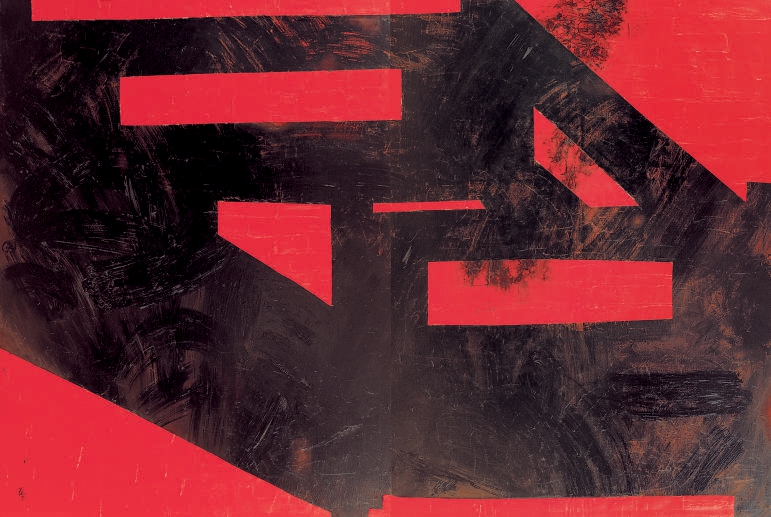 1999年至2003年之間,《直角》《椅子和椅子》《某年某月某日》《自己和自己的影子》《行》《四合》《紅》等一批作品接連問世。人們在這批作品中已經看不到王懷慶曾經過硬的速寫功底、塑造人物的肖像能力以及唯美而簡淡的詩境,只留下更加冷峻理性的圖式與筆觸。這些“物形”被解構的畫面讓觀眾直接越過客體,進入交錯線條節奏與結構的審美,引發對人與天、人與地、人與人、人與己四合關系的深層思考。王懷慶試圖給這個紛亂世界以秩序的力量。