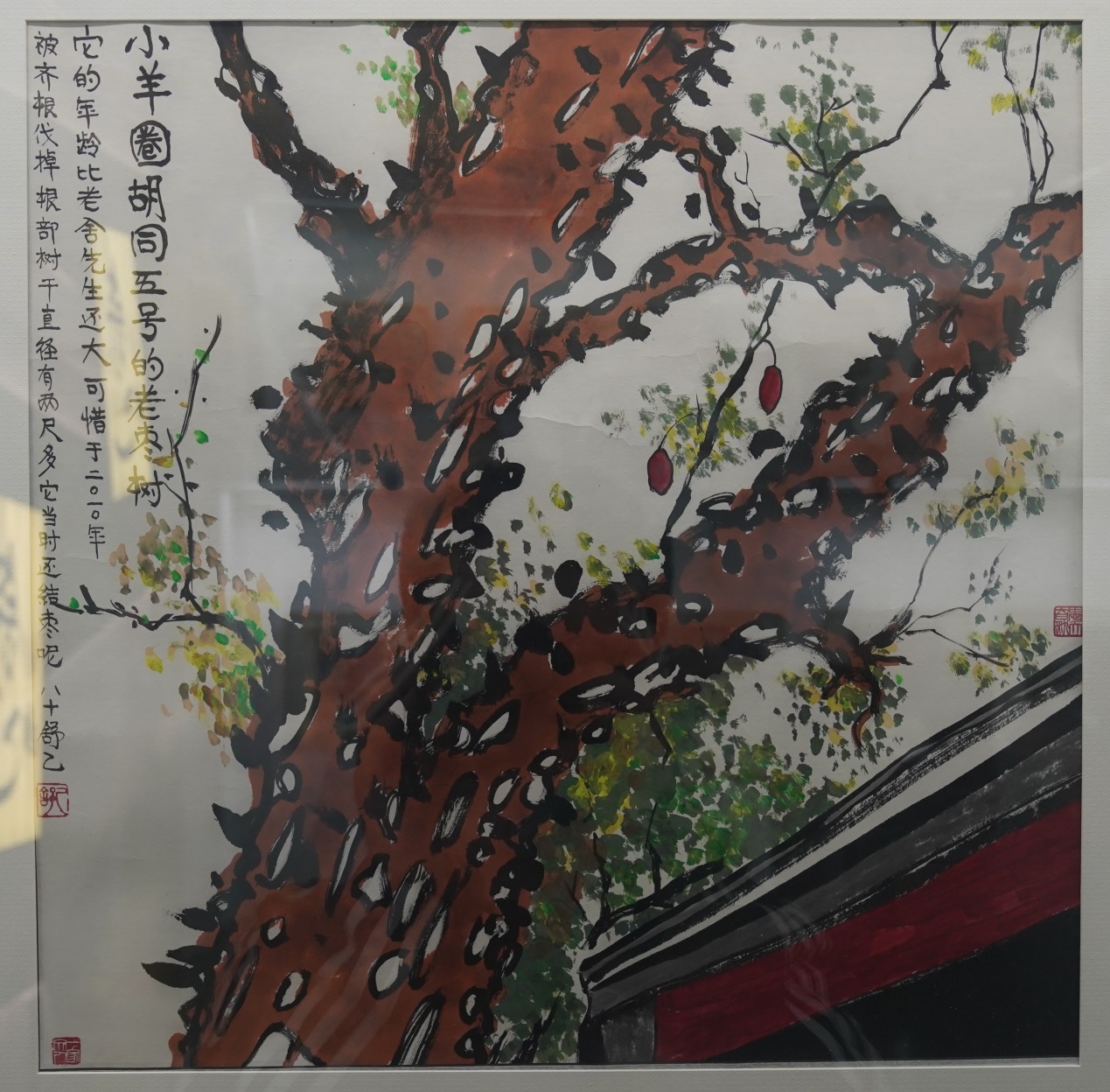 《小羊圈胡同五號的老棗樹》,舒乙繪于2015年,82cm×82cm。這幅畫作上,舒乙題記“它的年齡比老舍先生還大,可惜于二〇一〇年被齊根伐掉。根部樹干直徑有兩尺多,它當時還結棗呢。八十舒乙”。