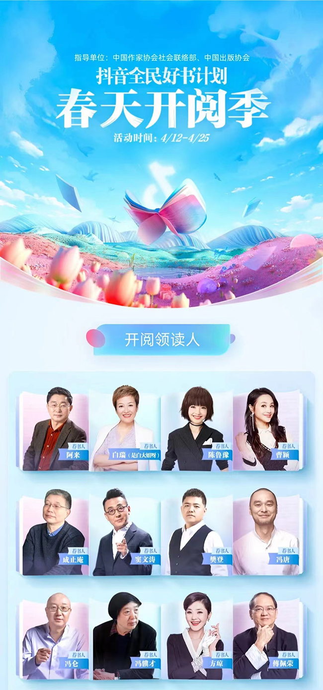 與抖音發起“抖音全民好書計劃·春天開閱季”系列活動,聯合多家媒體機構、出版機構,通過系列直播、短視頻等形式,鼓勵群眾分享新書好書,倡導全民閱讀,自4月12日活動啟動以來,目前全網觀看量達2.6億。