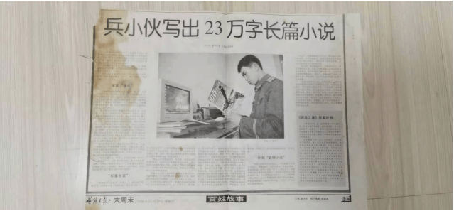 銀月光華:第一本小說初稿完成之后,一直想拿出去試試自己什么水平。當時我用電腦單機操作,用3.5寸軟盤刻錄好內容,郵寄給朋友發表,當時就被鐵血的編輯看中,正式簽約,這是意外之喜。那時候沒有因為這本小說賺到錢,但卻是一種重要的肯定。小說完結后受到了當地日報的關注,某一個下午記者來部隊采訪,當時部隊干部也很高興,認為我是給部隊爭光了,報道發表后我沒想到篇幅居然很大,大概有半開報紙的四分之一版面,照片還很清晰。我最親愛的姥姥還把報道壓在茶幾下,逢人來便能看到,姥姥去世后,我把那份報道留到現在。