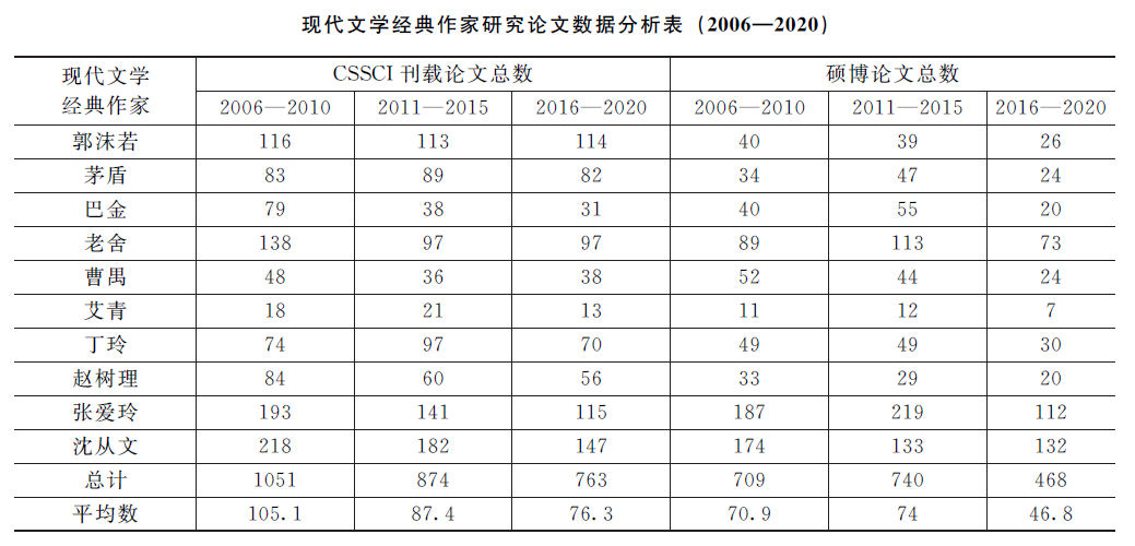 文學經典是一個詩性的敞開空間,在生產與接受過程中,打上了不同時代的思想文化烙印。近百年中國新文學經典的生成與中國社會急劇變革的歷史語境密切關聯?;仡櫺轮袊?0多年現代文學經典傳播接受的歷史,大致上經歷了三個時期:20世紀50—70年代,以政治視角為主導闡釋經典的30年;80—90年代,以文化視角為主要視角解讀經典的新時期20年;2000年后,以多元話語解讀經典的新世紀20年。整體上呈現為由“共名”走向“無名”的學術面向。近20年,中國現代文學經典研究與市場經濟轉型相逢,與新時期大眾文化思潮相遇,受碎片化信息傳播影響,現代文學經典研究(除少數或個別經典作家外)整體上呈現弱化趨勢。根據知網數據,我們分三個五年時間段,統計分析了近15年(2006—2020)CSSCI來源期刊發表的研究現代文學經典作家(被中國現代文學史列專門章節討論的重點作家,除魯迅外)的論文與研究現代經典作家的碩博論文(見下表)。經過比較,近5年經典作家研究的CSSCI論文與碩博論文數量均呈現明顯下降趨勢。隨著高等院校碩士博士生招收數量的增加、中文專業現代文學研究教學從業人員的增加,現代文學領域學術成果數量整體上呈上升趨勢,但經典作家研究論文則在減少,比例明顯下降。