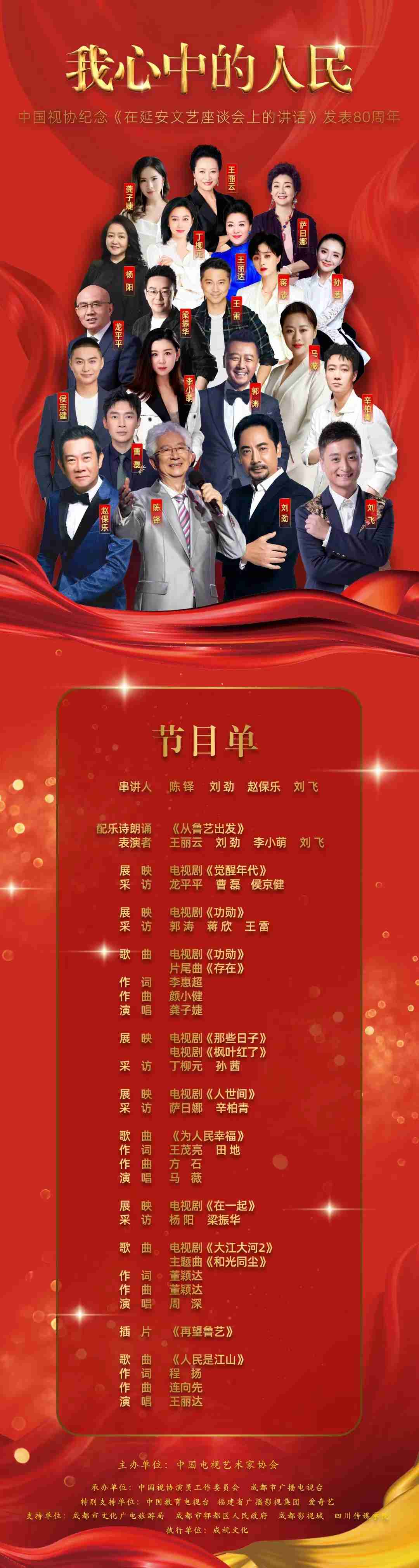 為了紀念毛澤東同志《在延安文藝座談會上的講話》發表80周年,高揚“文藝為人民服務”的主題思想,由中國電視藝術家協會主辦,中國視協演員工作委員會、成都市廣播電視臺具體承制的“我心中的人民——紀念《在延安文藝座談會上的講話》發表80周年”特別節目將于2022年5月23日正式上線播出。
