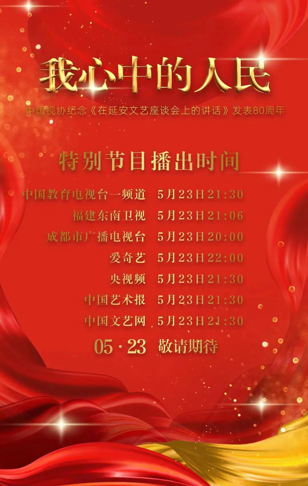 特別節目將于5月23日20:00起在中國教育電視臺一頻道、 福建東南衛視、成都市廣播電視臺、愛奇藝、央視頻、中國藝術報、中國文藝網等三十余家媒體上線播出,敬請期待!