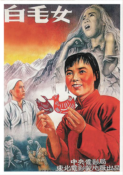 電影《白毛女》海報由享有“海報泰斗”之譽的顏地先生繪制,是一幅水粉畫。海報對比鮮明,濃縮了影片精華。畫面前景為暖色調,喜兒身穿紅色棉襖、手拿自己剪的一對紅色鴛鴦窗花,紅潤的臉龐笑容洋溢,還有一頭烏黑亮麗的秀發,整個人活潑可愛。背景則為冷色調,從雪山洞窟出來的“白毛仙姑”披頭散發,雙手回抱在肩,口張大、眉頭緊鎖,表情痛苦。冷色調與暖色調、黑頭發與白頭發、可愛與恐怖,這種對比的手法,深刻揭示出“舊社會把人逼成‘鬼’,新社會把‘鬼’變成人”的主題,給觀眾留下強烈的心靈震撼。