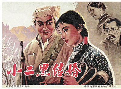 在延安文藝座談會的影響下,作家趙樹理于1943年創作完成短篇小說《小二黑結婚》。1964年,由北京電影制片廠根據該小說改編的同名電影上映,以電影的形式重溫了抗戰時期青年小二黑和小芹為追求婚姻自由,在黨的關懷下沖破封建家長阻撓、結為夫婦的故事。電影《小二黑結婚》海報由著名軍旅畫家江平先生繪就。海報承襲了原著及影片活潑、清新的格調,富有質樸、濃郁的山西鄉土氣息,凸顯出解放區進步青年的形象。