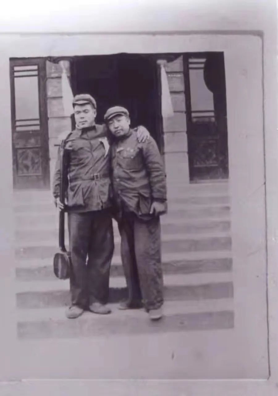 1950年,韓起祥(左)與陜北說書《劉巧團圓》記錄整理者高敏夫(延安魯藝人)合影