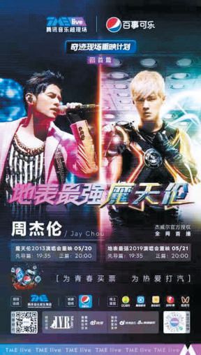 崔健演唱會和周杰倫演唱會重映的商業模式十分典型。前者由著名車企贊助,后者由騰訊音樂娛樂集團推出,而騰訊音樂也正好是周杰倫在線音樂播放的版權方。對于在線音樂平臺來說,誰擁有了版權,誰就擁有“大秀肌肉”的權力。除了騰訊的加持,某飲品廠商的標志也始終出現在重映的屏幕上,作為贊助方顯示了極強的存在感。