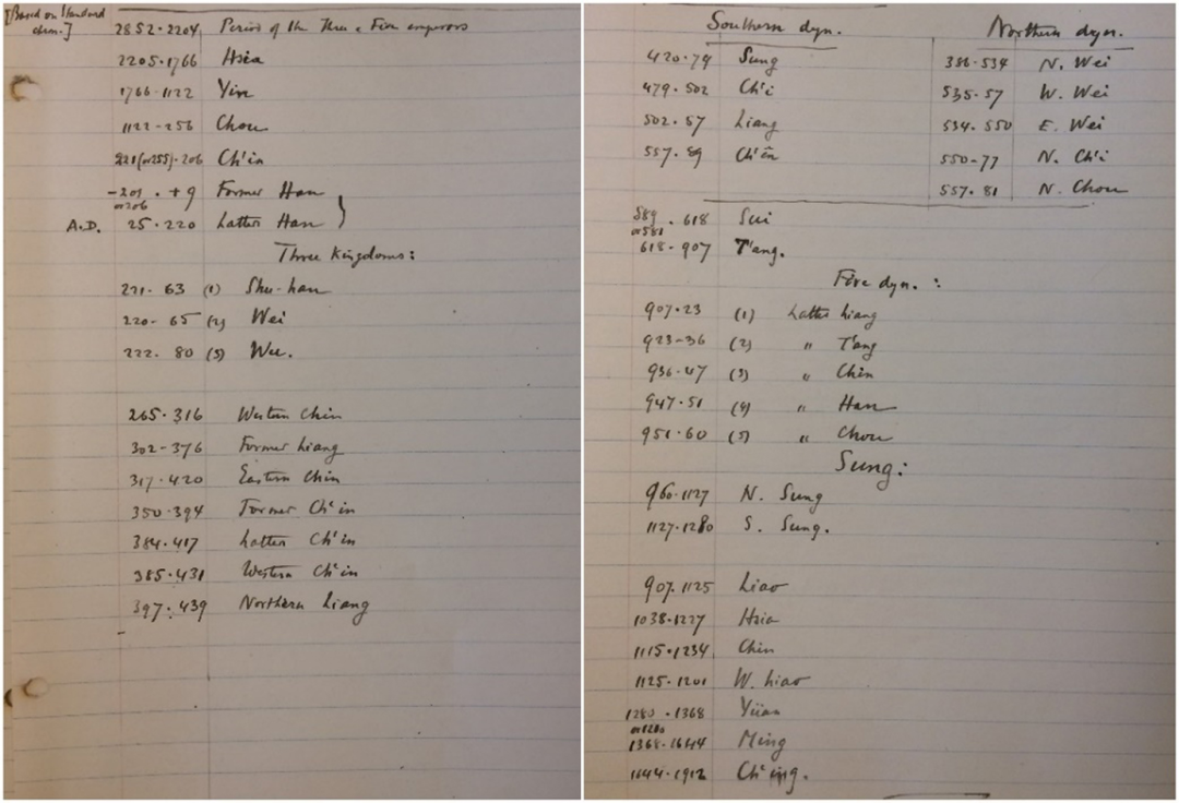 圖2 薩頓手寫的中國朝代表