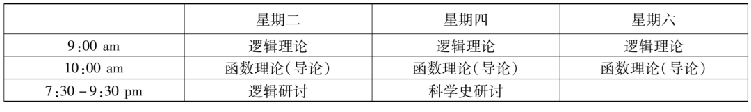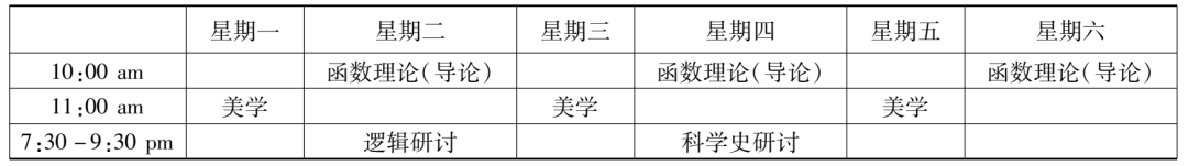 在哈佛大學學習的三年,趙元任每年都修了“邏輯研討”課程。1916至1917學年,此課的主題是“哲學技巧領域中多種科學方法的問題”(problems in philosophical techniques, of various scientific method),顯然是對上個學年課程內容的延續。不過,課程主持人換成了韓德森和協佛。若伊思于1916年9月,新學年開啟之際,溘然長逝。趙元任本學年上學期另外上的一門邏輯課——“邏輯研究”,是由侯恩雷(R. F. A. [Reinhold Friedrich Alfred] Hoernlé)講授的,內容是對邏輯學和認識論的理論進行比較研究(a comparative study of logic and epistemological theories),尤其是針對布拉德利(Francis H. Bradley)和鮑??˙ernard Bosanquet)的著作,也還會參考羅素(Bertrand Russell)、胡塞爾(Edmund Husserl)和邁農(Alexius Meinong)的著作。這些哲學家那時都尚未過世,正聲名顯赫。這個課看起來與趙元任已修過的“知識理論研討”一課有承接關系,但估計有些難度,特別是對本科生而言,因為課程特別說明了,選這課的學生需做好充足的準備。趙元任這一年修的“科學史研討”課程由薩頓主持,圍繞“物理科學的歷史”(history of the physical sciences)展開,目標是基于數理科學(mathematical and physical sciences)的歷史,對其根本的原則和理論進行分析與討論,還會就其來源進行比較研究。修這課并不需要先掌握高深的科學知識,因為課程研究的每個概念或想法都將針對特定的問題,從最初的起點進入。除了“美學”是通修課,“函數理論(導論)”“邏輯研討”“邏輯理論”“科學史研討”均是研究生基礎課。結合這五門課的時間信息,由此,趙元任1916至1917學年的課程表(見表2、表3)亦得再現。