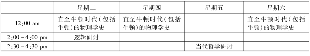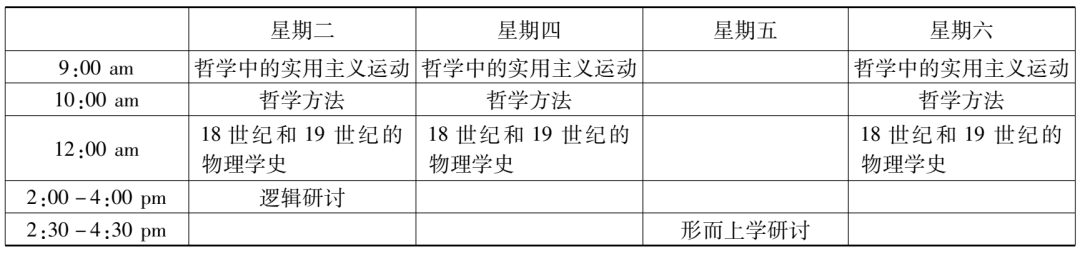 而“哲學23a2號課”的課名是“哲學方法”(philosophic method),依然是協佛開的課。它是大類課程“哲學23號課”(Philosophy 23)的分支課,“哲學23號課”之總名為“知識理論”(theory of knowledge),其目標是對與知識的方法、效度(validity)和限度(limits)有關的一些基本問題進行邏輯分析。這七門課程中,兩門科學史課程和“哲學中的實用主義運動”是通修課,余下的其他課程則全是研究生基礎課。趙元任這個學年的課程表(見表4、表5)也可以通過綜合這些課程的上課時間重新列出。