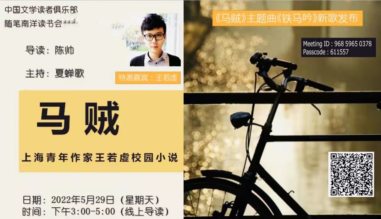 5月29日,新加坡中國文學讀者俱樂部組織導讀中國青年作家王若虛的校園小說《馬賊》,由新加坡作家陳帥主講?;顒觿撔铝诵问?,特別邀請新加坡音樂人以原創主題歌曲的方式參加?;顒油ㄟ^Zoom平臺在線上舉行,并在新加坡國家圖書館的臉書頁面進行了直播。作家王若虛在線與讀者進行了深度交流。