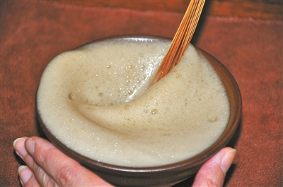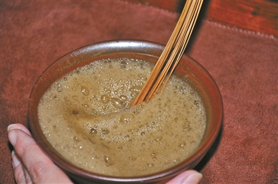第三步:繼續續水,繼續攪拌,泡沫越來越厚,茶湯越來越白