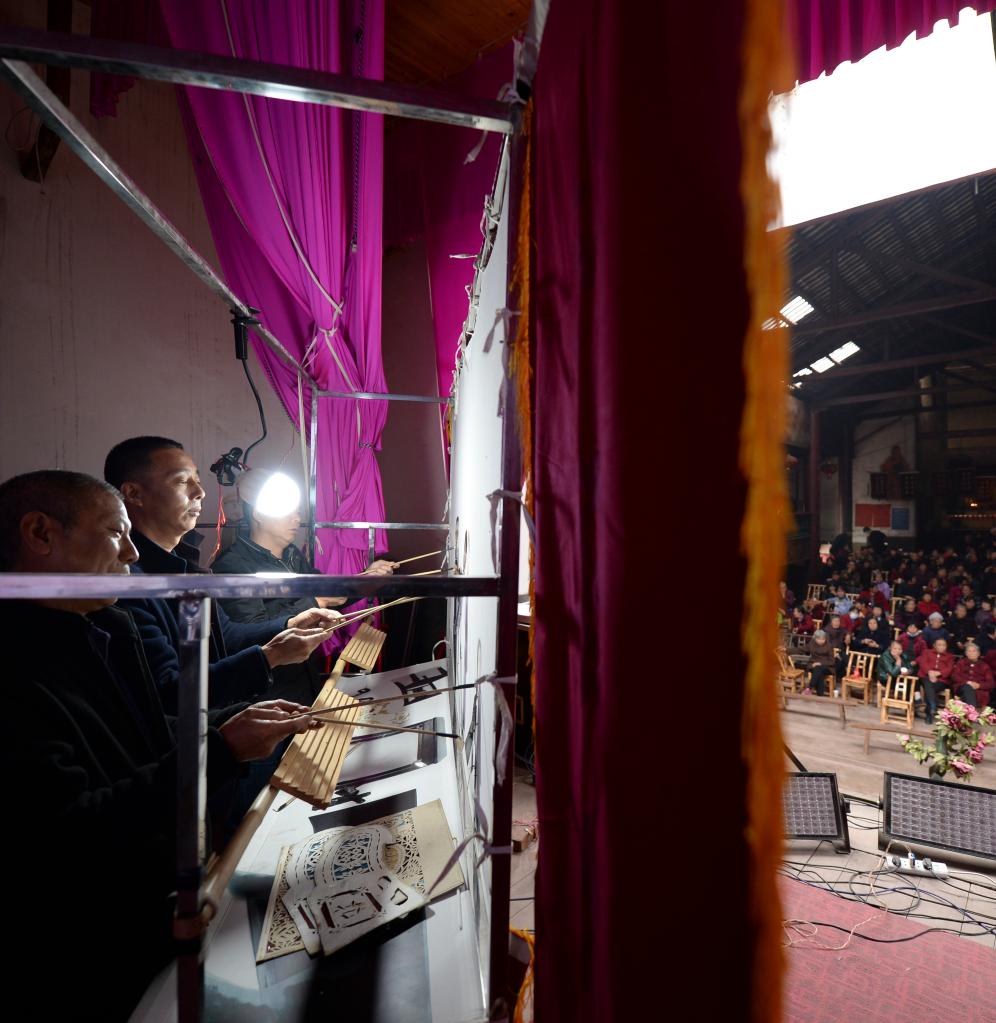 在湖南省瀏陽市沙市鎮秧田村,宋偉軍(左二)和劇團成員表演皮影戲(2021年11月16日攝)。新華社記者 陳振海 攝