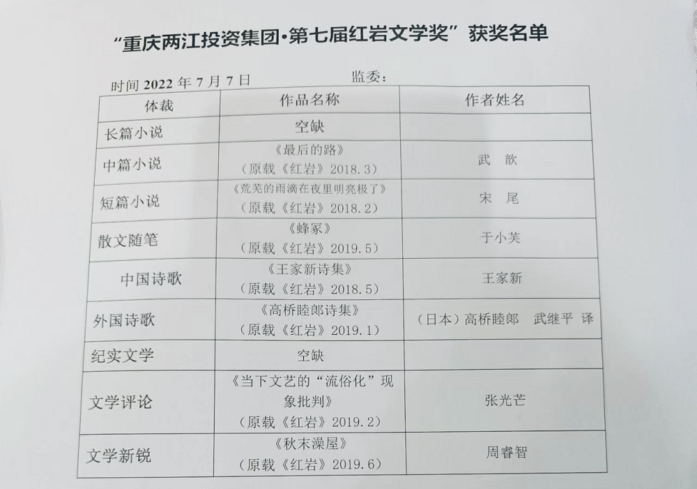 7月7日中午,“重慶兩江投資集團·第七屆紅巖文學獎”評選結果正式出爐。重慶日報記者從紅巖文學獎新聞發布會獲悉,在本屆紅巖文學獎設置的9個獎項中,除了長篇小說與紀實文學兩個獎項空缺外,其他7個獎項分別被7位作家、詩人摘得。其中,重慶本土作家占了兩席,分別是短篇小說獎得主宋尾、文學新銳獎得主周睿智。