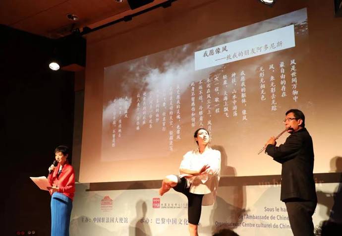 在約一小時的朗誦會上,趙麗宏、陳東東、李少君、歐陽江河等四位中國詩人通過視頻分別朗誦了個人代表詩作。旅法詩人張如凌、法國當代詩人湯斯林、青年演員金祎和凡維登現場朗誦了法文版《我愿像風》《指紋》《北方》《應該對春天有所表示》《誰去誰留》等多首詩歌作品,大提琴家馬修、長笛演奏家王偉和舞蹈家王文虎傾情獻藝,為每首詩歌營造出獨特的氛圍。悠揚的長笛、渾厚的大提琴、空靈的塤、多變的口簧琴和曼妙的舞姿與抑揚頓挫的朗誦聲交織共融,引領觀眾在音與畫的世界里徜徉,體味詩歌中描繪的獨特意境,感知心靈的觸動與震撼,尋找精神的共通與思想的共鳴。