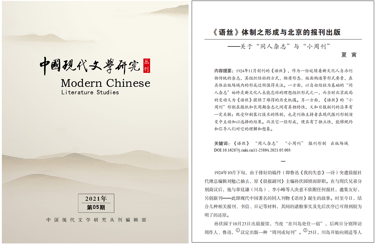 經過《叢刊》執行編委、責任編輯的推薦和評委的投票,共有7篇論文獲得《叢刊》2021年度論文獎,其中蘇心、夏寅獲得“博士生獎”。北京大學中文系在讀博士夏寅憑借《〈語絲〉體制之形成與北京的報刊出版——關于“同人雜志”與“小周刊”》(《叢刊》2021年第5期)一文獲獎,在接受中國作家網采訪時他表示,獲獎極為驚喜、深感鼓舞,希望未來能繼續對現代文學的生產方式及其文獻學特點等問題一探究竟。