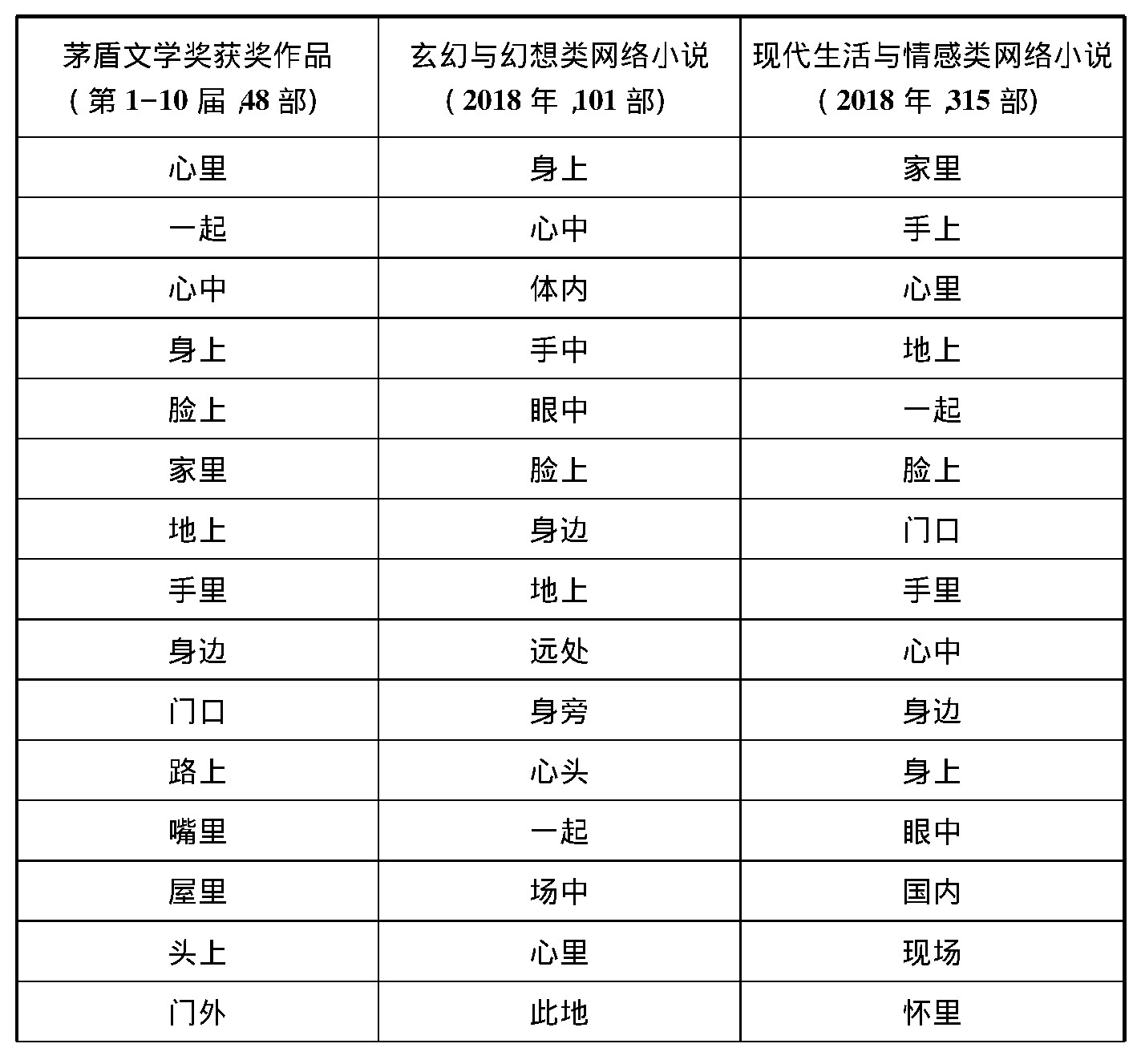 在歷屆茅盾文學獎獲獎作品的場景高頻詞統計結果中,一方面,“心里”是當之無愧的第一高頻詞,在統計數值上遙遙領先于后面其他場景的高頻詞4,而且其近義詞“心中”也排在第三位。另一方面,具體到針對每部獲獎作品的分析數據中,我們也發現“心里”作為場景高頻詞普遍排位較高的情況,其中“心里”作為第一場景高頻詞的作品有28部,作為第二場景高頻詞的作品有10部,作為第三場景高頻詞的作品有2部,此外還有2部作品的第一場景高頻詞為“心中”———即“心里”的同義詞。5而在2018年中國101部玄幻與幻想類網絡小說的場景高頻詞統計結果中,“心里”的次序則比較靠后(僅為第14位),而與其意思相近的“心中”“心頭”排名則相對靠前,分別為第2和第11位。在2018年中國315部現代生活與情感類網絡小說的場景高頻詞統計結果中,“心里”和其近義詞“心中”則分別位列第3和第9。