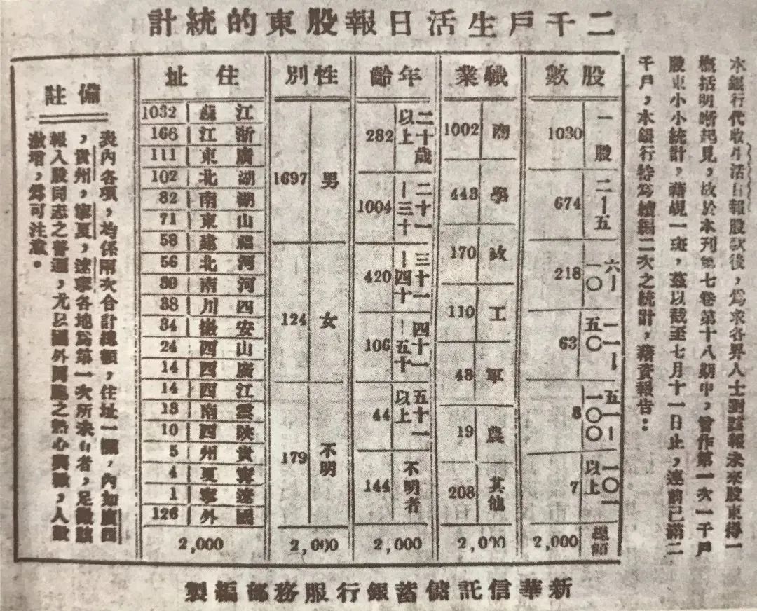 新華信托儲蓄銀行代收《生活日報》股款時,對二千戶股東所作的統計(來源:《韜奮》,三聯書店編,生活·讀書·新知三聯書店2004年版)